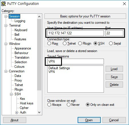 4. Session 탭으로 돌아가서 Save 를 누른 후, Open 으로 접속 및 로그인 합니다.