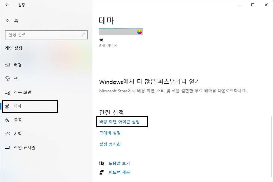 3. 테마 - 바탕 화면 아이콘 설정 을 클릭합니다.