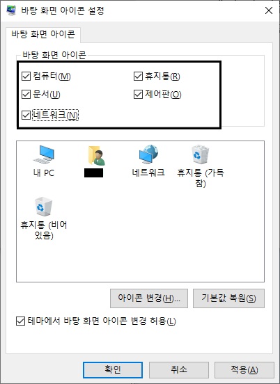 4. 바탕화면에 표시를 원하는 아이콘에 체크합니다.