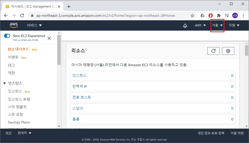 EC2 리전을 지정하는 방법은 AWS 의 우측 상단 '서울' 부분에서 지정할 수 있습니다.