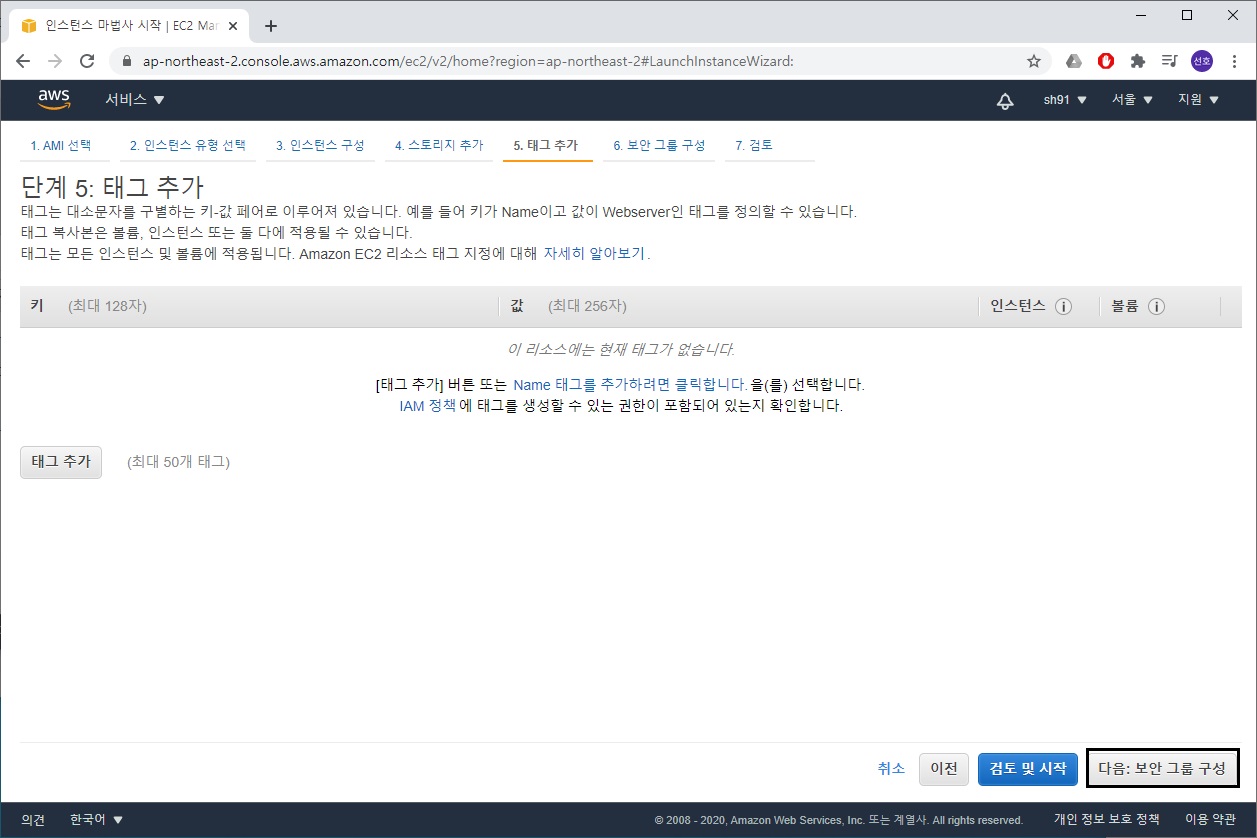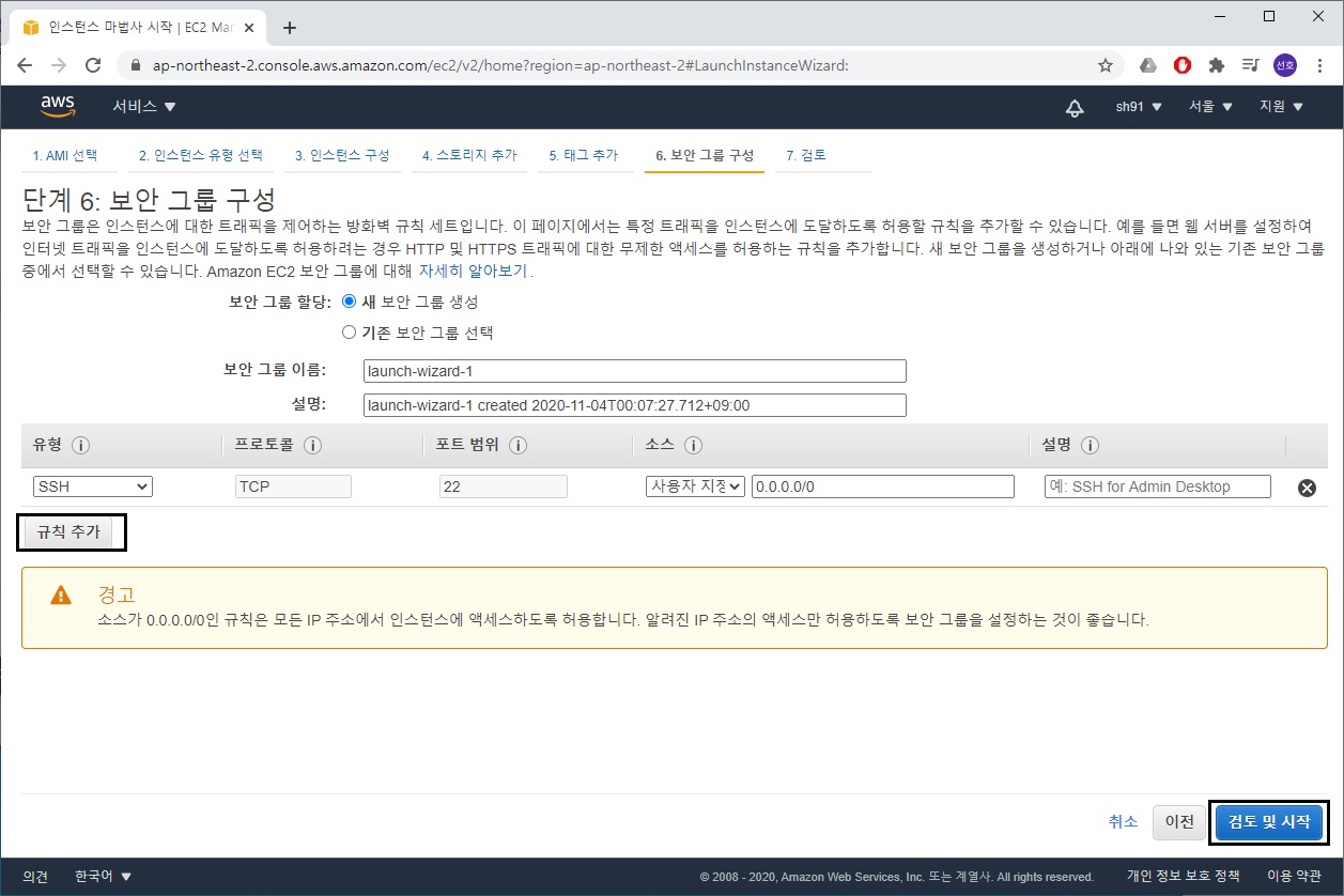 보안 규칙까지 구성을 완료했으면 '검토 및 시작'을 눌러 인스턴스를 생성합니다.