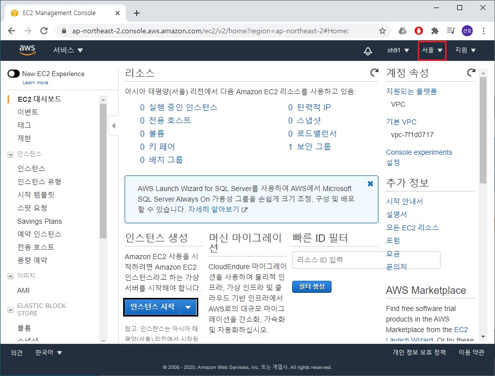 1. 리전 선택 후 인스턴스 시작 클릭