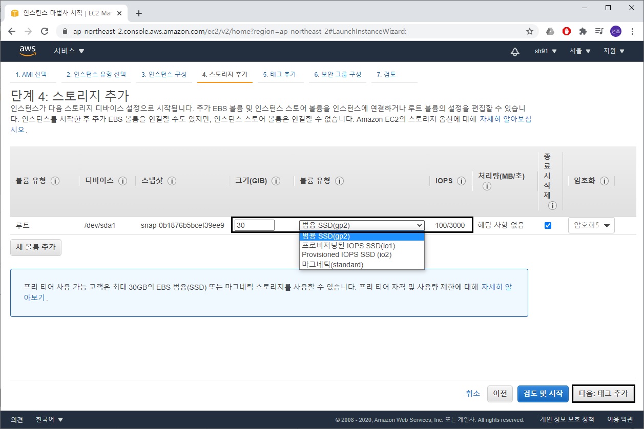 프리 티어의 경우 30GB 까지는 무료로 사용이 가능하기 때문에, 크기를 30 으로 변경해 주는 것이 좋습니다.
