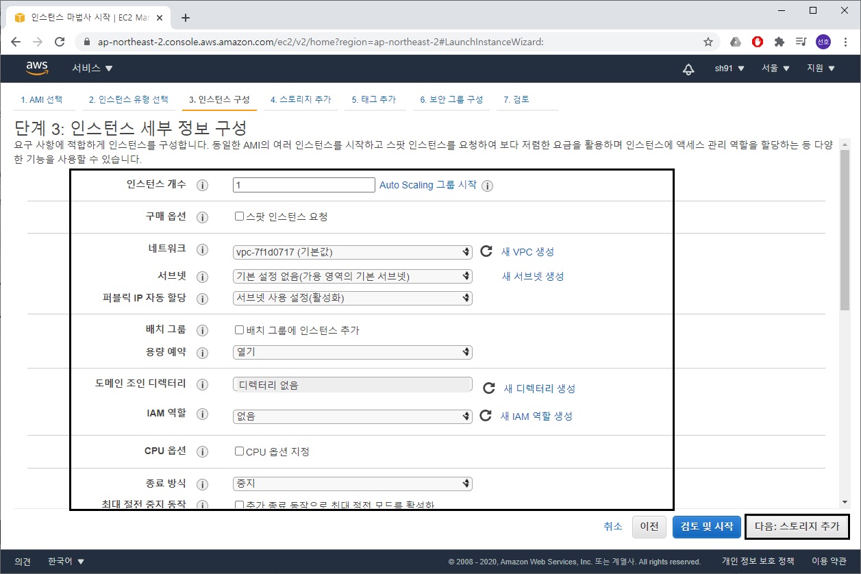 또한 생성하면서 저장공간, 네트워크 IP 주소, 보안 등을 함께 설정할 수 있습니다.
