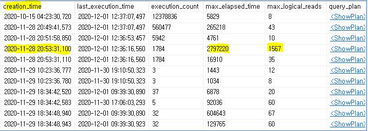 2. max_elapsed_time 과 max_logical_reads 를 확인합니다.