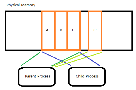 5. 부모프로세스는 쓰기작업이 발생하는 페이지를 먼저 복사한 후 수정합니다. ( Copy-on-Write 방식 )