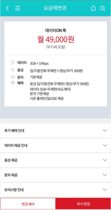 3. 몇시간이 흐른뒤인지는 모르겠지만, 암튼 2일 당일날 Y 데이터 ON 톡 (49,000, 데이터 6GB LTE + 속도제한있는 무제한 ) 요금제로 변경하였습니다.