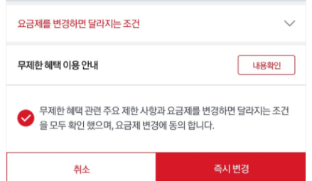 Step 2. 체크버튼 클릭하고 즉시변경을 클릭하면 요금제가 변경