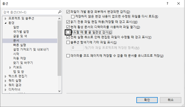 3. "로드할 때 줄 끝 일관성 검사" 를 체크해제 합니다.