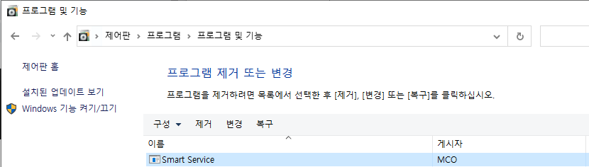 제어판의 프로그램 및 기능으로 들어간 뒤 Smart Service 프로그램을 찾아서 지워주면 됩니다.