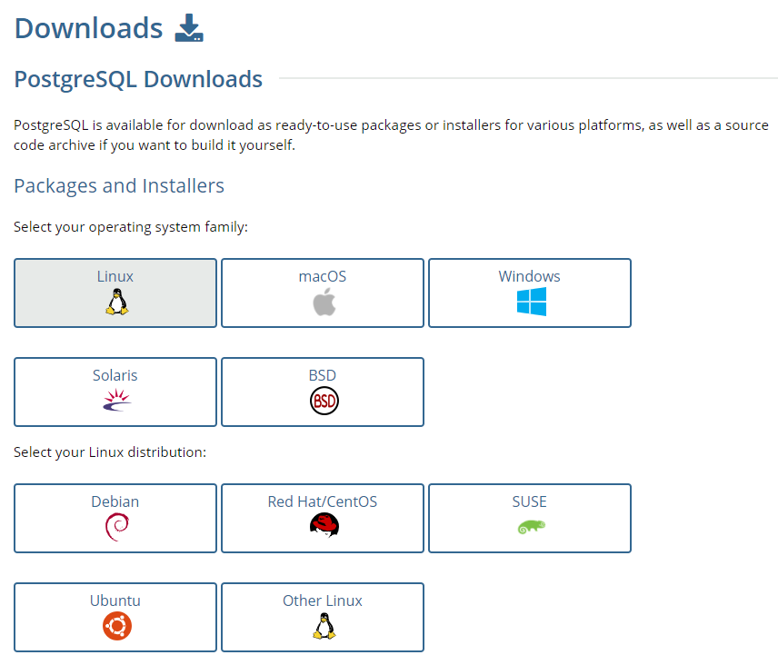Downloads PostgreSQL Downloads PostgreSQL is available for download as ready-to-use packages or installers for various platforms, as well as a source code archive if you want to build it yourself. Packages and Installers Select your operating system family