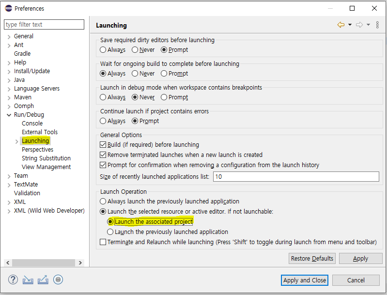 2. Launching 에서 Launch the associated project 를 선택합니다.
