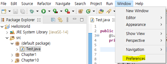 1. 이클립스에서 Window - Preferences 로 들어갑니다.