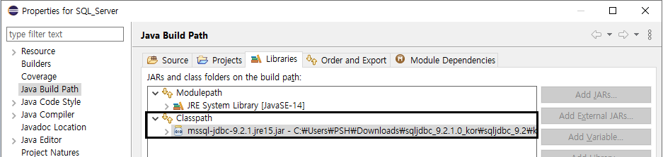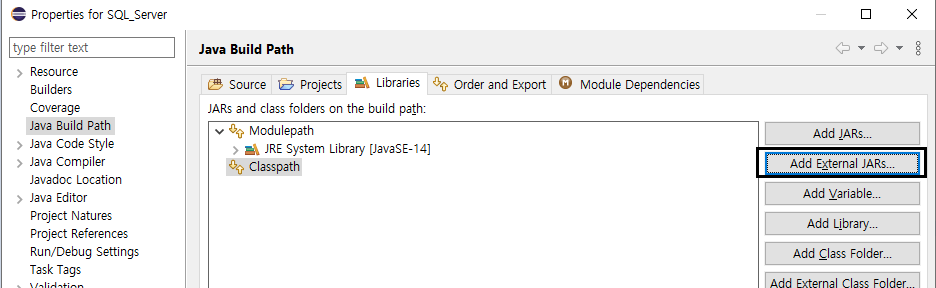 이클립스에서 이 SQL Server 전용 JDBC jar 파일을 등록하여 SQL Server 와 연동해보도록 하겠습니다.