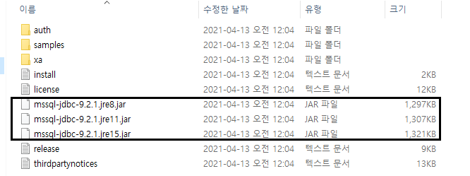 JDBC Driver 9.2 기준으로 다운로드한 압축파일을 풀면 mssql-jdbc-jre8 / jre11 / jre15 가 있습니다.