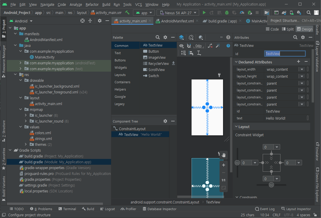 하나의 레이아웃에는 텍스트뷰, 버튼 등의 여러 위젯을 선언할 수 있으며 이 위젯들은 ID 로 구분이 됩니다.