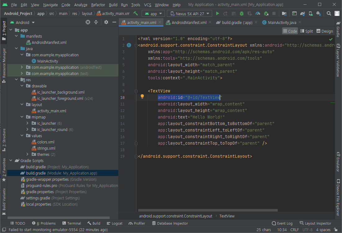 findViewByID 에서 activity_main.xml 레이아웃에 있는 TextView ID 를 TextView 객체에 담아줍니다.