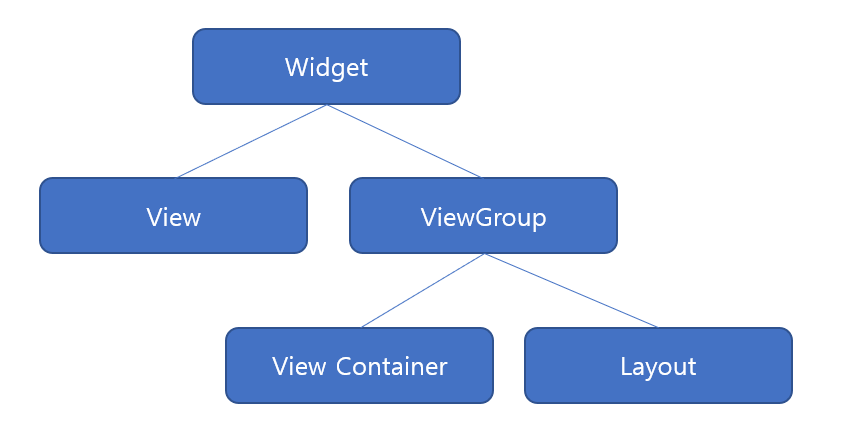 이 중에서 View 클래스를 상속해서 만들어진 위젯을 뷰라고 부르고 ViewGroup 클래스를 상속한 위젯을 뷰그룹이라고 부릅니다.