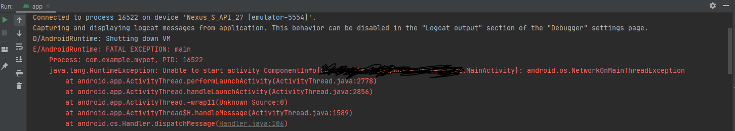 이 때 별도의 Thread 로 구현이 되어있지 않아서 아래사진과 같은 오류가 발생하게 됩니다.