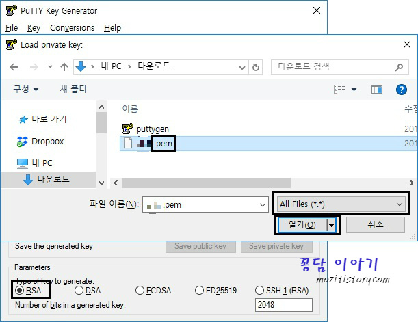 4. 다운로드한 키페어 pem 파일을 선택합니다.