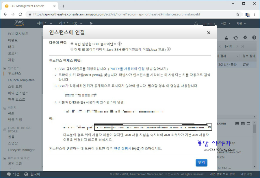 9. 인스턴스 연결의 pem 파일 뒤의 네모박스 내용을 복사합니다.