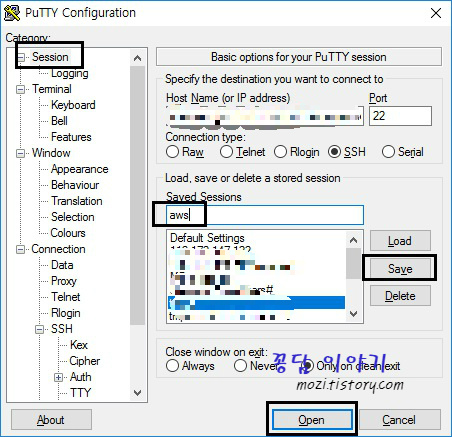 15. Session 탭으로 돌아와 Saved Sessions 에 값을 입력한 후 Save 를 클릭합니다.