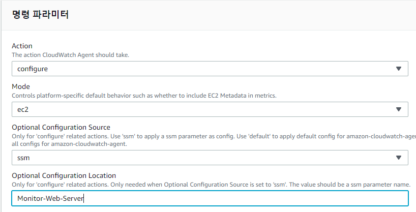 이 파라미터는 Run Command 를 사용하여 웹 서버에서 CloudWatch 에이전트를 시작할 때 사용됩니다.