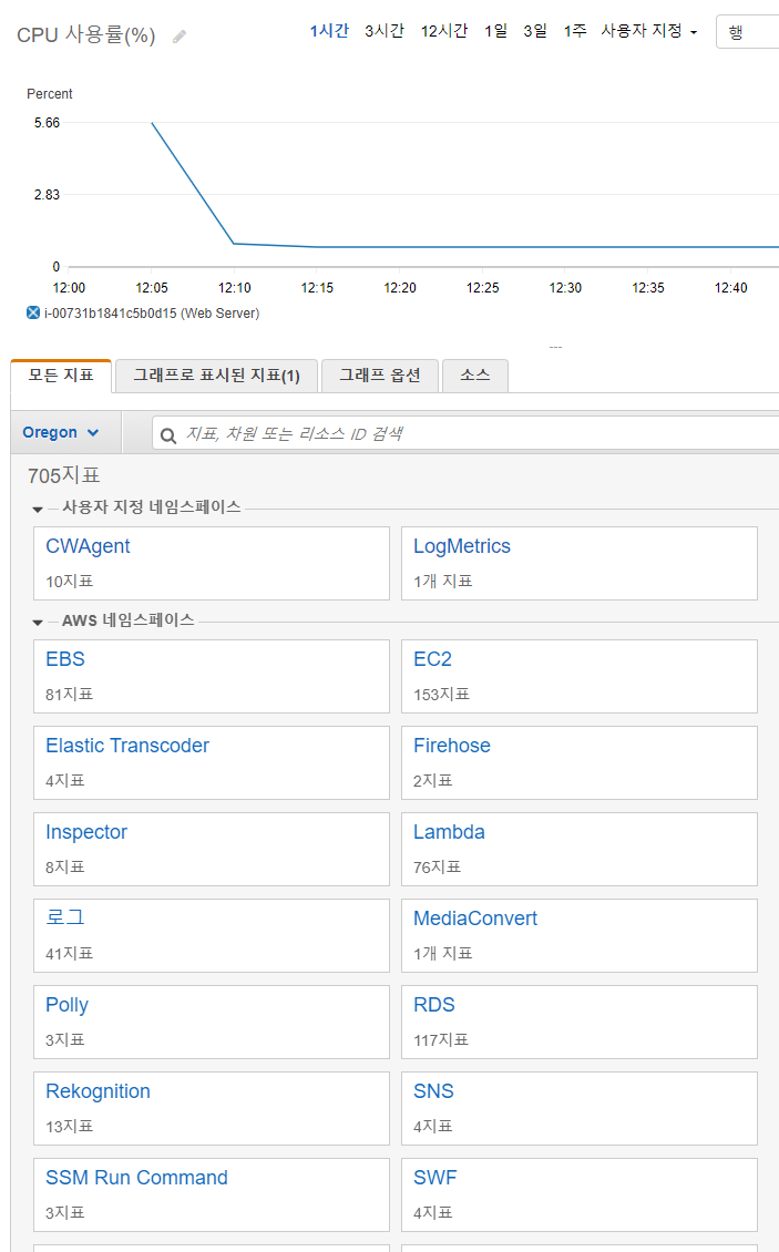 여기에는 CloudWatch 가 수집한 다양한 지표와 EC2 위에서 수행하는 CloudWatch 에이전트가 수집한 지표가 있습니다.