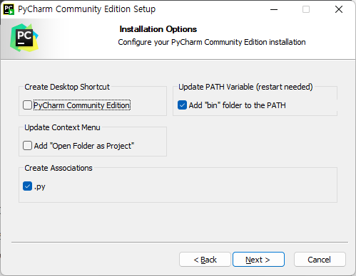 나머지 2개는 바탕화면에 pycharm 실행파일 생성과, 폴더 우클릭 시 pycharm 에서 열건지를 물어보는 기능입니다.