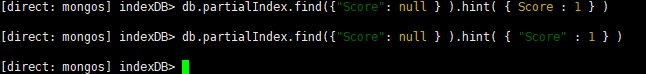 [direct: mongos] indexDB> db.partialIndex.find({"Score": null } ).hint( { "Score" : 1 } )