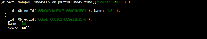 [direct: mongos] indexDB> db.partialIndex.find({"Score": null } )