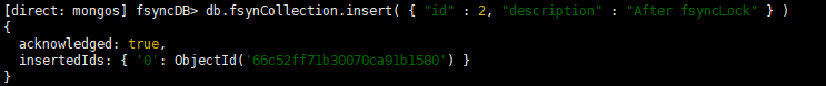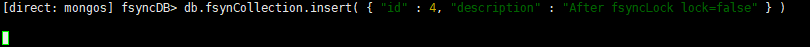 [direct: mongos] fsyncDB> db.fsynCollection.insert( { "id" : 2, "description" : "After fsyncLock" } )