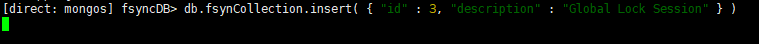 [direct: mongos] fsyncDB> db.fsynCollection.insert( { "id" : 3, "description" : "Global Lock Session" } )