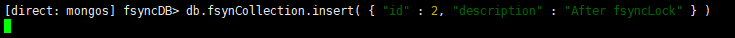 [direct: mongos] fsyncDB> db.fsynCollection.insert( { "id" : 1, "description" : "Before fsyncLock" } )